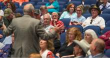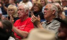 They cut him off midsentence only to applaud and cheer his statements. They clapped when he took the stage and when he left it. And they squashed opposition from the handful of detractors in the audience by yelling back "Let him talk" and, "Who paid you to come?"