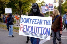 The group chants "Hey, hey! Ho, ho! This corporate greed has got to go!" and carries signs with such messages as "Socialism for the rich, socialized debt for the 99%?" A woman suggests "1-2-3-4, Obama is a corporate whore" and then disclaims, "But I don't mean to insult whores." One man stops to pick up a floundering butterfly that has apparently been struck by a car. He's just moving it to the grass, he says.