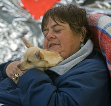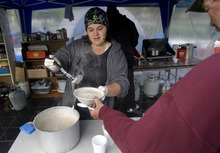 Many of the kitchen workers, like Michael, come from the shelters to the park only to volunteer. Stacey Allen, 55, moved to Salt Lake City a month and a half ago from California with her steelworker husband because they heard there were more jobs in Utah. Neither found work and they moved from motels to a shelter. She shows up to manage the camp kitchen every day for one reason: "I heard they needed help in the kitchen." Her husband used his construction skills to rebuild the camp kitchen.