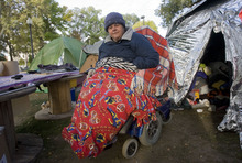 "I saw some people I knew, and they asked me if I wanted to help," says Cynthia, 52. She got a donated tent and has been at Pioneer Park since then. Although the temperature is dropping toward 30 degrees, she says she is happier at the camp for now.