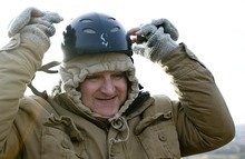 Saturday morning, he strapped on braces and wrapped himself in bulky warm clothing until he stood and walked like the Tin Man of Oz. So stoked with endorphins after his flight, he just about jogged to rejoin his sister, Joan Johnson, who whooped along with him every time he passed overhead.