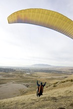 For one thing, he's harnessed to Damion Mitchell, a certified paragliding instructor sitting in the sling right behind him. For another, Davis woke up four times in the night in anticipation of the Saturday event "It was like Christmas Eve," he says. And now the chute has blossomed and he's yelled "Hooah!" at least three times, so off they go. During the 20-minute flight above and down the south side of the flight park, Davis hollers with joy.