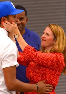 Frank Jackson is congratulated by his father Alvin and mother Juleen after Jackson's announ