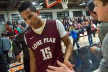 Lone Peak's Frank Jackson (15) leaves the court after the game at Wasatch Academy Thursday December 10, 2015. Lone Peak won the game 68-65.