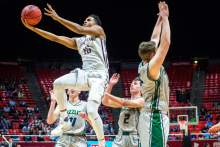 Lone Peak's Frank Jackson (15) shoots past Copper Hills' Trevor Hoffman (2) Copper Hills' Charles Olsen (21) and Copper Hills' Porter Hawkins (11) during the 5A boy's basketball tournament at the Huntsman Center at the University of Utah Thursday March 3, 2016. Copper Hills is winning the game 33-22 at halftime.