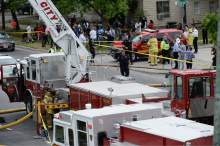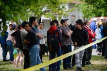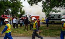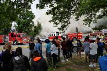 People gather to watch as firefighters from across the city battle a two house fire at 900 W. 151 S. in Salt Lake City that sent smoke across the city on Monday, May 15, 2017.