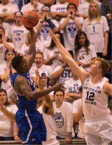 Brigham Young Cougars forward Eric Mika (12) shoots, as Texas-Arlington Mavericks forward Julian Harris (20) and Texas-Arlington Mavericks forward Faith Pope (34) defend, in NIT basketball action Brigham Young Cougars vs. Texas-Arlington Mavericks, at the Marriott Center, Wednesday, March 15, 2017.