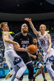 Brigham Young Cougars forward Eric Mika (12) and Brigham Young Cougars guard TJ Haws (30) guard Gonzaga Bulldogs center Przemek Karnowski (24) during the game at the Marriott Center Thursday February 2, 2017.