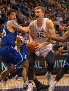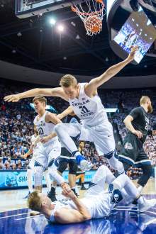 Brigham Young Cougars forward Braiden Shaw (31) jumps over Brigham Young Cougars forward Eric Mika (12) during the game at the Marriott Center Thursday February 2, 2017.
