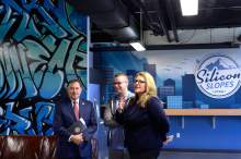 Utah Gov. Gary Herbert, speaks with Silicon Slopes Executive Director Clint Betts, center, and Silicon Slopes board member Carine Clark as they show him around the new Silicon Slopes space in Lehi on Wednesday.