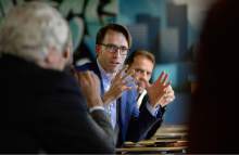 Brad Rencher, exec VP of Adobe in Utah, asks Utah Gov. Gary Herbert, and Lt. Gov. Spencer Cox a question about the diversity, planning, and transportation. He, along with other tech executives met with Herbert and Cox prior to a ribbon cutting ceremony at Silicon Slopes, the organization that promotes the growth of high tech business in Utah, which opened a new headquarters in Lehi, Wednesday, May 17, 2017.