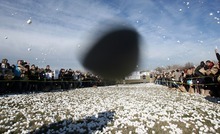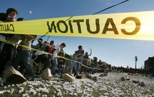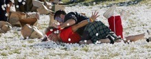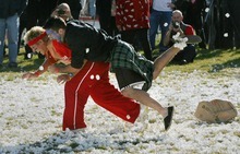 Eisenhower Junior High School teacher, and team captain, Zach Layton, tackles fellow teacher and apposing captain, Denise Fiack, on the battlefield as hundreds of students at Eisenhower Junior High tried to set a new world record for the World's Largest Marshmallow Fight by throwing or tossing nearly 2,000 pounds of 140,000 regular-sized marshmallows in about 15 minutes.in Taylorsville, Utah Friday, December 2, 2011.