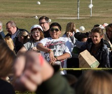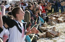 Hundreds of students at Eisenhower Junior High School try to set a new world record for the world's largest marshmallow fight by throwing or tossing nearly 2,000 pounds of 140,000 regular-sized marshmallows in about 15 minutes in Taylorsville Friday.