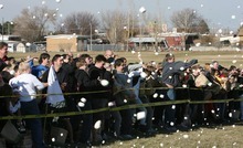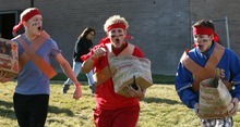 Eisenhower Junior High School teacher Denise Fiack, center, leads her team to the battlefield as hundreds of students at Eisenhower Junior High tried to set a new world record for the World's Largest Marshmallow Fight by throwing or tossing nearly 2,000 pounds of 140,000 regular-sized marshmallows in about 15 minutes.in Taylorsville, Utah Friday, December 2, 2011.