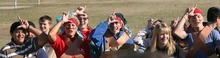 Eisenhower Junior High School teacher Denise Fiack, second from left, leads her team in taunting the enemy as hundreds of students at the school tried to set a new world record for the World's Largest Marshmallow Fight by throwing or tossing nearly 2,000 pounds of 140,000 regular-sized marshmallows in about 15 minutes.in Taylorsville, Utah Friday, December 2, 2011.