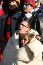 Snow College students Josh Burt and his girlfriend Hannah Olsen snuggle together in the freezing temperatures during football game at Rio Tinto Stadium.