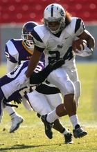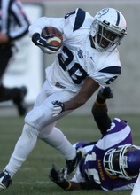 Snow College's Alamoti Vaenuku slips through the grasp of Eastern Arizona's Eric Walker on his 43-yard touchdown run in the 2nd quarter.