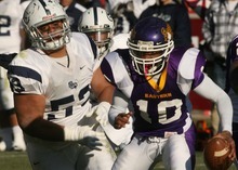 Eastern Arizona's quarterback Devontae Glover-Wright feels the heat from Snow's Siale Hauta