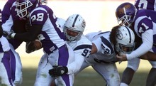 Eastern Arizona's Rashon Evans is brought down by Snow College's Matt Tanuvasa (5) and Cody Van Buren (89).