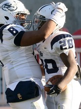 Snow College's Breon Allen celebrates his touchdown in the 2nd half with teammate Soni Kinikini.