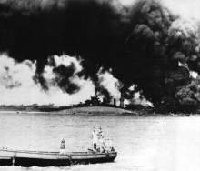 Japanese torpedoes struck the USS Oklahoma, causing it to capsize. The attack killed 429 crewmen the most of any vessel at Pearl Harbor other than the USS Arizona.