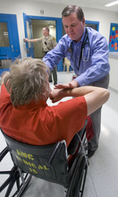 The patient in red scrubs has a history of heart attacks and deep vein thrombosis. He's on oxygen, and barely lifts his head as a physician listens to his heart. Out on the street, he's capable of drinking a half-gallon of cheap booze a day.