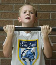 "It's hard for me because I have longer legs," the third-grader explains. But he decides to take a break to stretch and then try again. He's sure he can hit the goal.