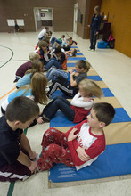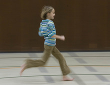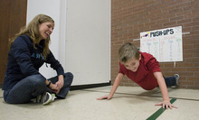 Sandy • Gabriel Curtis, 9, sits in the gym at Park Lane Elementary with his feet pressed against a wooden box and his fingertips reaching in front of him as far as they can go. He doesn't quite meet the mark for the sit-and-reach portion of the President's Challenge.