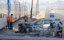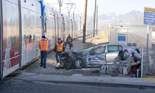 The accident in the intersection of 8600 South and 3200 West happened at 9:23 a.m., said West Jordan police Sgt. Drew Sanders. The Dodge Neon was traveling east on 8600 South, parallel with the train. At the intersection, which has a stoplight, the car turned right, crashing through the guard arms and into the train.