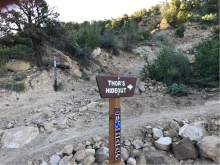 At 0.7 miles, you will reach a fence and a junction with other trails. You are on the saddle. Follow the signs for Thor's Hideout.