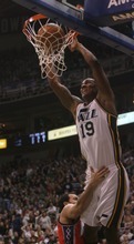 Utah Jazz player Paul Millsap dunks the ball over the head of New Jersey Nets player Kris Humphr