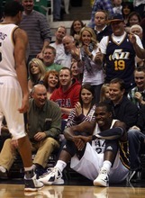 Utah Jazz player Paul Millsap sits in the crowd at the end of the first half reacting to the big lead over the New Jersey Nets at EnergySolutions Arena in Salt Lake City on Saturday.