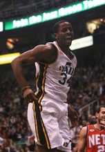C.J. Mills of the Jazz reacts to dunking the ball after a turnover by the New Jersey Nets during the first half of game at EnergySolutions Arena in Salt Lake City on Saturday.