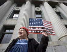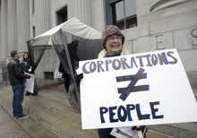 The retired Clearfield Job Corps counselor held a sign saying "Corporations are not people, $ is not speech."