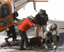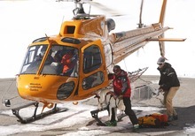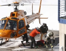 Two people involved in an avalanche get out of a Wasatch Powderbird helicopter at Snowbird