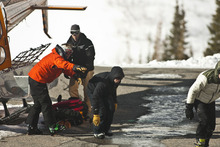 Two people involved in an avalanche get out of a Wasatch Powderbird helicopter at Snowbird Saturday January 28, 2012. One person died in an avalanche in the backcountry between Big and Little Cottonwood canyons late Saturday morning. Unified Police Department Lt. Justin Hoyal said a group of three people were skiing on Kessler Ridge, an area that drops down into Mineral Fork Canyon in Big Cottonwood Canyon, when the avalanche was triggered at about 11:30 a.m.