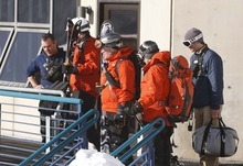 Friends of the 25-year-old male who died in an avalanche are led away from the Wasatch Powderbird helicopter that brought all three and their rescuers out of the canyon. One person died in an avalanche in the backcountry between Big and Little Cottonwood canyons late Saturday, January 28, 2012. A group of three people were skiing on Kessler Ridge, an area that drops down into Mineral Fork Canyon in Big Cottonwood Canyon, when the avalanche was triggered at about 11:30 a.m. Wasatch Backcountry Rescue and several other crews searched the area with dogs and were able to eventually locate the victim. Hoyal said the skier was found dead at the scene at about 12:45 p.m.