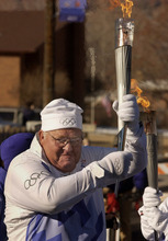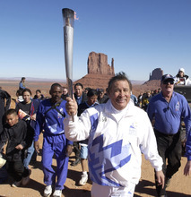Legendary distance runner Billy Mills runs the Olympic torch up the final hill to light a cauldron at Monument Valley in the Navajo Tribal Park at the Utah-Arizona state line. Mills shockingly won the 10,000 meters at the 1964 Tokyo Games, becoming the only Native American to win an Olympic gold medal.
