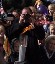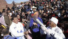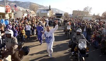 Massess of people, mostly Navajo, crowd around Willfred Billey, right, a Navajo code talker from Farmington, N.M., as he lights the Olympic torch of legendary runner. An estimated 10,000 fans attended the run through Monument Valley in the Navajo Tribal Park.