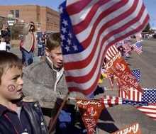 Children from Belknap Elementary School in Beaver chant "U-S-A!" and wave flags as they watch th
