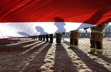 Firefighters hold a giant American flag at Eccles Coliseum as the torch arrives in Cedar City.