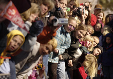 Fans lean over a rope, eager to get a photo as a torchbearer approaches in Richfield.