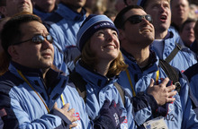 Biathlete Andrea Nahrgang, center, coach William Tavares, left, and doctor Ed Merrens listen to the playing of the national anthem as members of the U.S. Olympic Team are greeted at the Olympic Village.