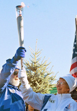 Orem's Donley Despain, left, helps hold the torch with Parowan's Carol Wright, a 93-year-old cous