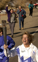 Moab's Julie Mueller is all smiles as she carries the torch through her hometown.