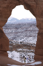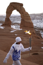 Stephanie Laree Spann carries the torch from Delicate Arch in Arches National Park, following a sunrise ceremony and blessing performed by her grandfather, Frank Arrowchis, a member of the Whiteriver band of the Northern Ute Indian Tribe.