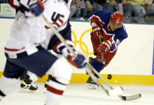 Russia's Sergei Fedorov passes past American defenders during a 2-2 tie in a preliminary-round