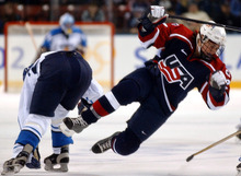 Tara Mounsey of the United States goes airborne after colliding with Finland's Katja Riipi during a 5-0 American victory in a preliminary-round women's hockey game at the E Center in West Valley City.