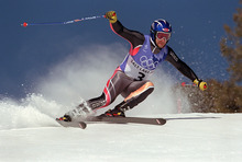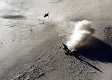 American A.J. Baer kicks up some snow as he skids out of control and misses a gate in the men's super-G at Snowbasin.