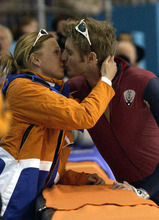 Speedskater Annamarie Thomas of the Netherlands congratulates American Joey Cheek after Cheek won the bronze medal in the men's 1,000 meters at the Utah Olympic Oval.